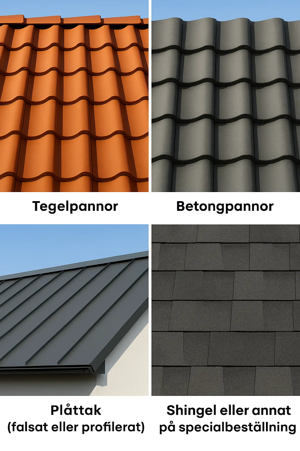 Vi arbetar med betongpannor, tegel, plåt och andra material som passar ditt hus och klimatet här.